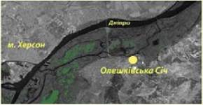 Місцерозташування Олешківської Січі на сучасній супутниковій карті