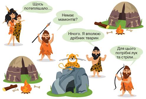 Роздивіться історичний комікс. Подумайте, як кліматичні зміни позначилися на житті первісних людей. Якого значення набуло збиральництво? Чи могло танення льодовика пожвавити рибальство? Які знаряддя праці могли виникати внаслідок потепління?