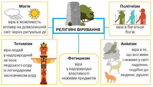 - 1. Як виникли первісні вірування? Поясніть поняття: «релігія», «магія», «анімізм», «тотемізм», «фетишизм».
