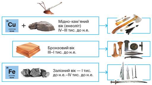 У місцевостях, де були поклади міді, яка дуже легко плавилась на вогні, люди почали виробляти з неї ножі, сокири, наконечники зброї. Для цього виготовляли форму з глини чи каменю і заливали до неї розплавлену мідь.