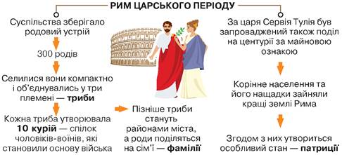 Від заснування Рима містом правили царі, кожного з них обирали на посаду пожиттєво. Цар поєднував владу воєначальника, верховного жерця та вищого судді. За статусом він був більше схожий не на східного деспота, а на племінного вождя. Важливу роль також відігравала рада старійшин — сенат. Його обирали з патриціанських родів — по одному сенатору від кожного роду. Зберігалися і народні збори як зібрання представників від кожної курії.