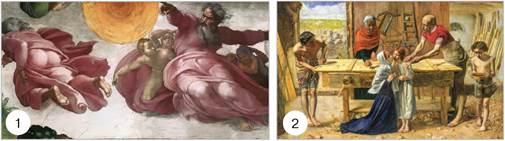 1. Порівняйте фрагмент розпису Мікеланджело Сікстинської капели (1) і картину Дж. Міллеса «Христос у будинку батьків» (2). Визначте, яку інформацію можна довідатися з них. Складіть розповідь.
