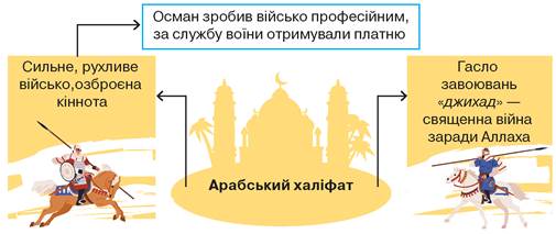 Швидке утворення величезної імперії пояснювалось низкою причин. По-перше, араби мали військову перевагу — їх військо було численним і рухливим, в основі його була добре озброєна кіннота. По-друге, завоювання здійснювалися під гаслом «джихаду», священної війни заради Аллаха та перемоги ісламу. Це надихало арабських воїнів. По-третє, Осман зробив військо професійним — замість того, щоб розподіляти землю між воїнами, він оголосив усю землю власністю халіфа, а за службу у війську встановив щорічну плату. Тому у Халіфаті не виникла родова аристократія, що могла складати конкуренцію владі халіфа.
