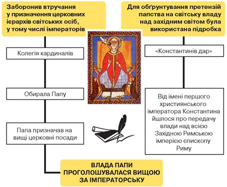 Розгляньте інфографіку. Охарактеризуйте реформи Григорія VII. Визначте, яким був їх вплив на стосунки між церквою та світською владою.