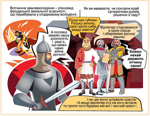 Розгляньте колаж. Спробуйте дати власне визначення поняттю «отчина». Які основні наслідки мав Любецький з’їзд для Київської держави?
