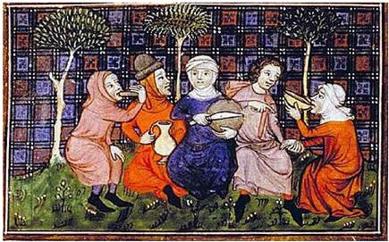 1. Мандрівники діляться хлібом та іншою їжею на полях (Livre du roi Modus et de la reine Ratio, XIV ст.).