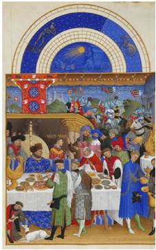 Герцог сидить за високим столом під розкішним балдахіном перед каміном, йому прислуговує кілька слуг, включаючи м’ясника. Ліворуч від Герцога — золота сільниця чи неф, у формі корабля (Розкішний часослов герцога Беррійського, 1410).