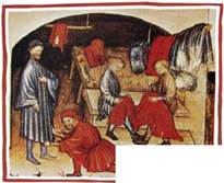 Робота в кравецькому цеху (середньовічна мініатюра)