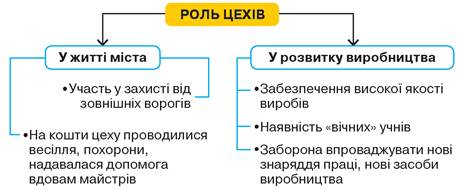 3. Який вплив на розвиток міст мали ремесло і торгівля? Якими були особливості існування міських середньовічних цехів? Скористайтеся запропонованим шаблоном-схемою.