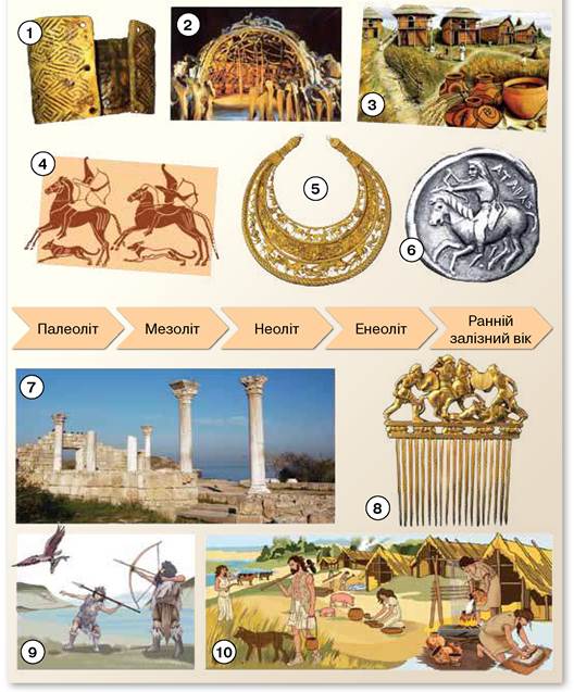- 4. Покажіть на карті України місця стоянок, регіони розселення народів, розташування міст, зображених у колажі.