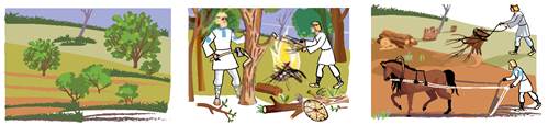 Підсічно-вогневе землеробство — ділянка під засів очищалася від дерев, які спалювалися (їх попіл слугував добривом), ділянку займали до виснаження ґрунту, потім переходили на нову.