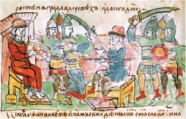 Вбивство деревлянами князя Ігоря (малюнок із Радзивіллівського літопису кінця XV ст.)