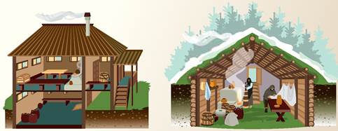Уважно розгляньте ілюстрації й опишіть житла давніх русів. Визначте, яке із жител є наземним, а яке — заглибленим. Поміркуйте, чому жителі Русі-України заглиблювали житла. Визначте, які будівельні матеріали використовували для будівництва в Русі-Україні.