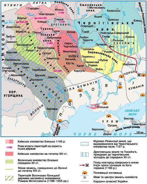 Із середини XII ст. Русь розпалася на ряд князівств. Спочатку їх було близько десяти, з часом внаслідок дроблення їхня кількість лише зростала. Пригадаймо, що подібні процеси роздробленості за доби Середньовіччя відбувалися і в інших європейських країнах. Тісно пов’язаними між собою залишалися Київське, Чернігівське, Турово-Пінське, Переяславське, Галицьке та Волинське князівства. Саме на цій території відбувалося формування українського народу. Закарпаття, заселене слов’янами, ще із середини XIII ст. входило до Угорщини, а на території Причорномор’я і Приазов’я жили половці.
