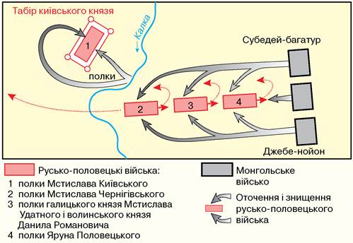 Звістку про монголів на Русь приніс половецький хан Котян. Половці були розбиті монголами, а їхні землі перебували під загрозою захоплення. Тому вони закликали руських князів на допомогу. У половецькі степи з дружинами прийшли князі Русі, зокрема галицький, київський, чернігівський. У першій битві біля Дніпра монголи були розбиті. 31 травня 1223 р. на берегах річки Калка зав’язалася вирішальна битва об’єднаних сил із монгольським військом. Відсутність спільного плану дій, загального керівництва, єдності під час битви між русинами та половцями мала трагічні наслідки. Союзники зазнали поразки.