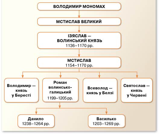 Розгляньте схему родоводу та простежте походження Романовичів від Володимира Мономаха.