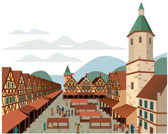 Львів у пізньому Середньовіччі ймовірно мав німецький тип забудови (за мотивами рисунка-реконструкції Ігоря Качора, XX ст.)